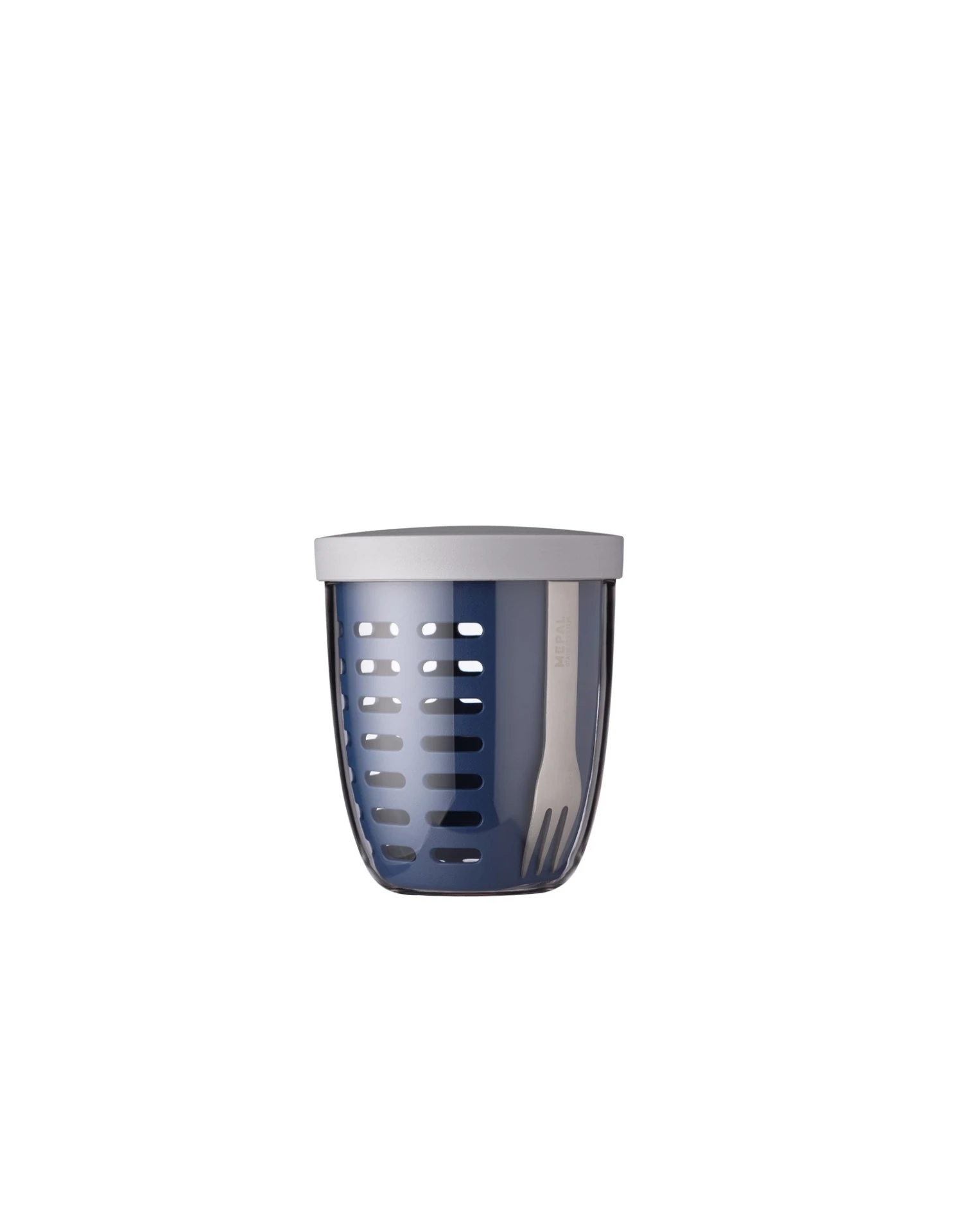 Mepal fruit- & veggiepot Ellipse in Nordic denim. Gezonde snoepers opgelet: meer groente en fruit eten wordt je vanaf nu wel héél makkelijk gemaakt. De fruit- & veggiepot is speciaal ontworpen om je fruit of groente ter plekke te wassen. Verse aardbeien prikken achter je computer of een vieruurtje van snoeptomaatjes in de trein… kom maar door met die vitamines! Het vergietje in de pot is zo ontworpen dat je jouw groente en fruit ter plekke even af kunt spoelen. Doordat er een beetje ruimte overblijft op de bodem kan je snack uitlekken zonder dat jij daar last van hebt. Een handig RVS vorkje wordt meegeleverd, zodat jij kunt genieten van de ideale snack on the go! Natuurlijk mag de fruit- en veggiepot na gebruik gewoon in de vaatwasser. Ook heel handig: de deksels van de fruit- & veggie-, lunch- en snackpotten zijn onderling uitwisselbaar.