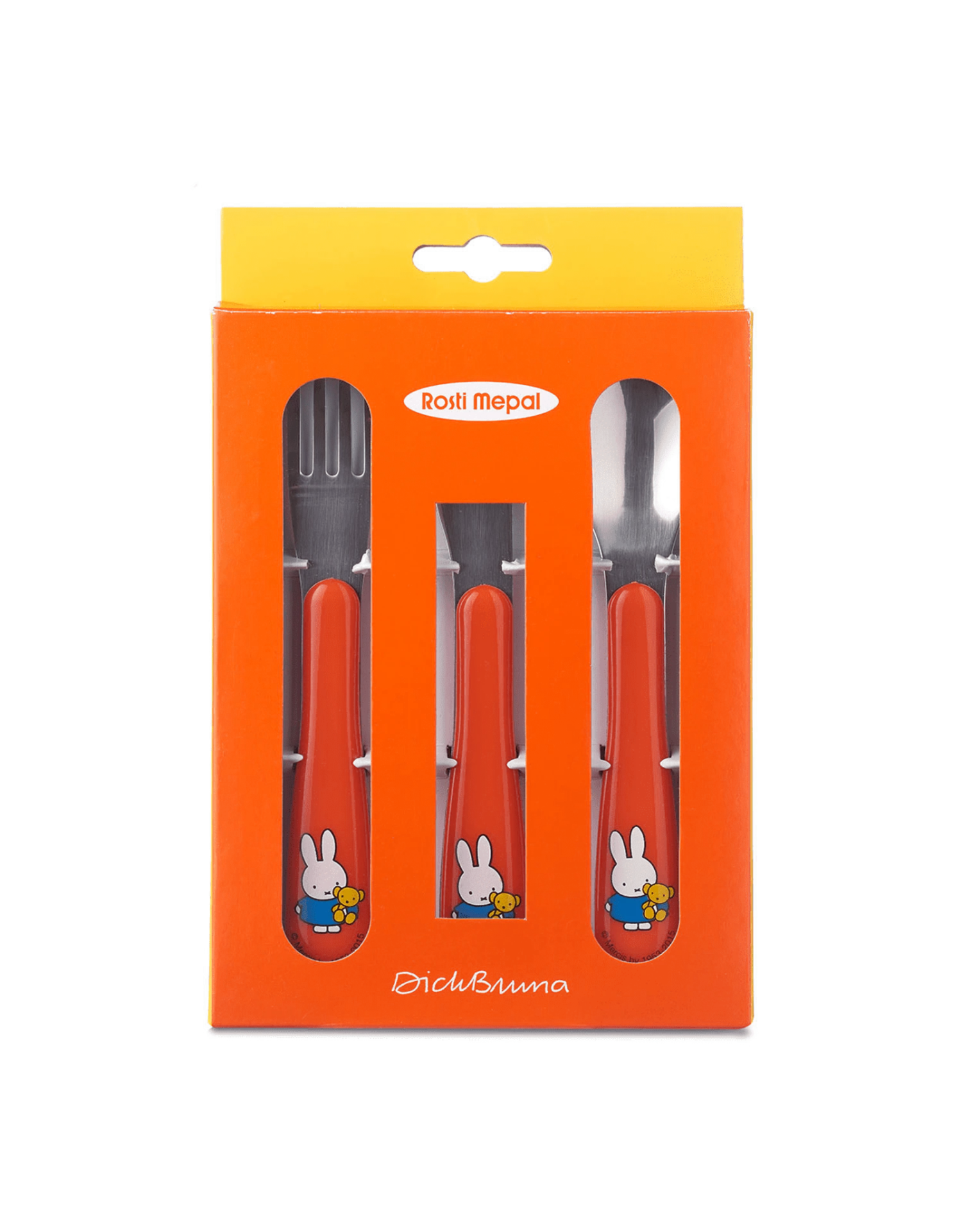 3-delige bestekset met Nijntje speelt afbeelding. Dit Nijntje besteksetje van Mepal bestaat uit een kleine kindervork, lepel en mesje en zit verpakt in een leuke geschenkverpakking. Op het oranje kinderbestek staat Nijntje met een knuffelbeer afgebeeld. Dit besteksetje is niet alleen leuk om te krijgen, maar ook zeer geschikt als kraamcadeau!