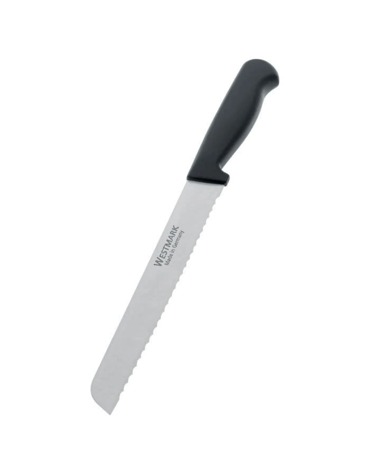 Het grote, functionele broodmes heeft een scherp Solingen gekarteld lemmet van roestvrij roestvrij staal en is ideaal voor het snijden en verdelen van brood, broodjes, croissants en dergelijke. De geïntegreerde vingerbescherming zorgt voor de nodige veiligheid op het werk.