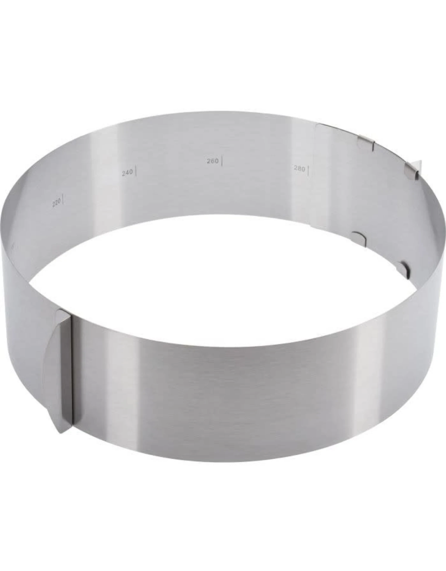 Met onze taartring maak je de lekkerste en mooiste taarten. De extra hoge rand maakt het mogelijk om verschillende bodems en vullingen in lagen te leggen en de praktische handvatten helpen bij het instellen van de juiste maat. Doordat de diameter variabel instelbaar is, ben je op elk recept voorbereid. Probeer het. (160-300 mm)