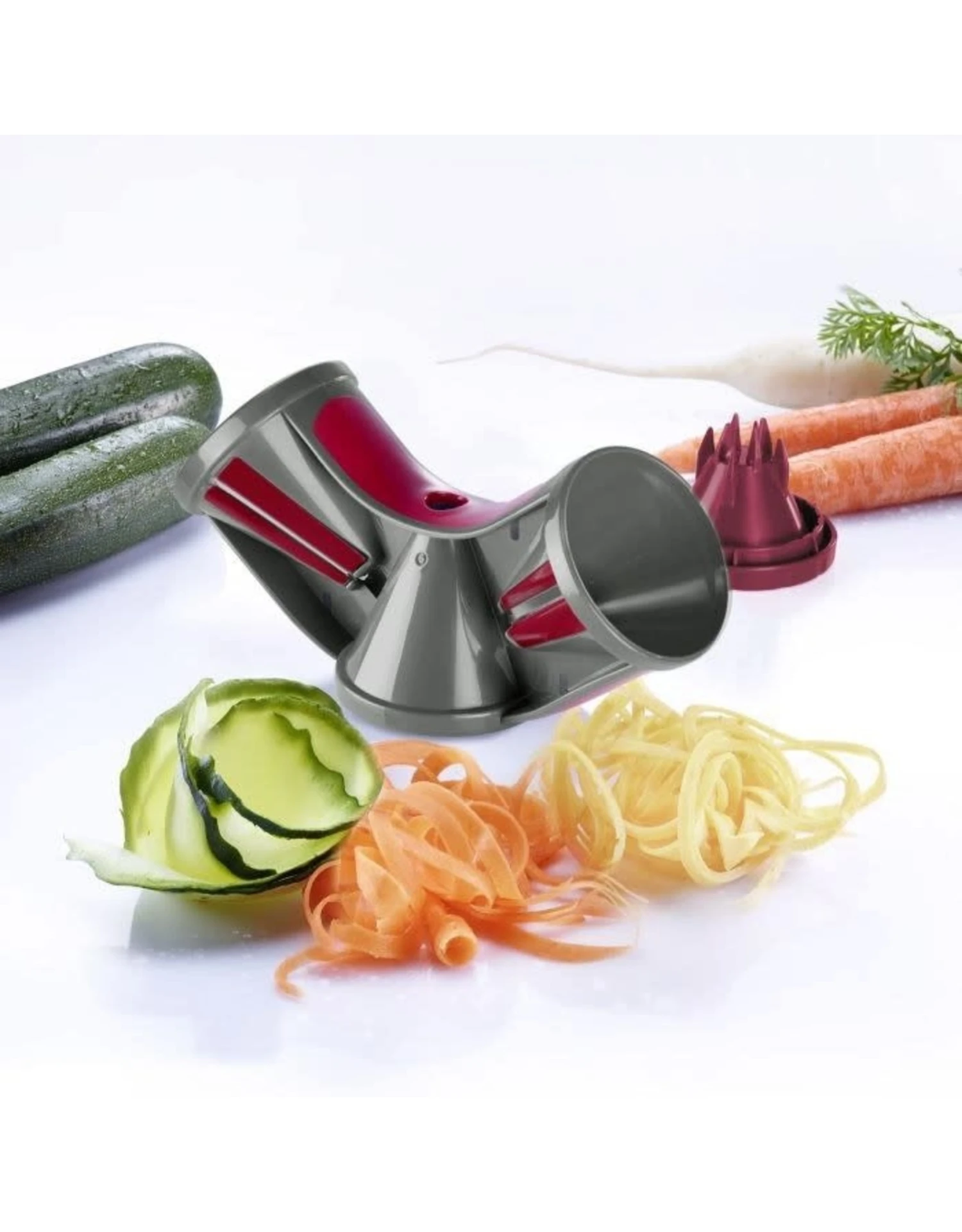 Deze handige spiraalsnijder heeft niet alleen 2, maar zelfs 3 snijkegels voor het individueel bereiden van de fijnste groentezoedels! Of het nu gaat om spiralen, dunnere of dikke julienne – zo vorm je zonder veel moeite je groenten voor gezonde pasta’s en rauwkostsalades. Uw voordeel: dankzij de voedselhouder beschermt u uw vingers tegen verwondingen en zorgt u er ook voor dat het voedsel optimaal wordt gebruikt.