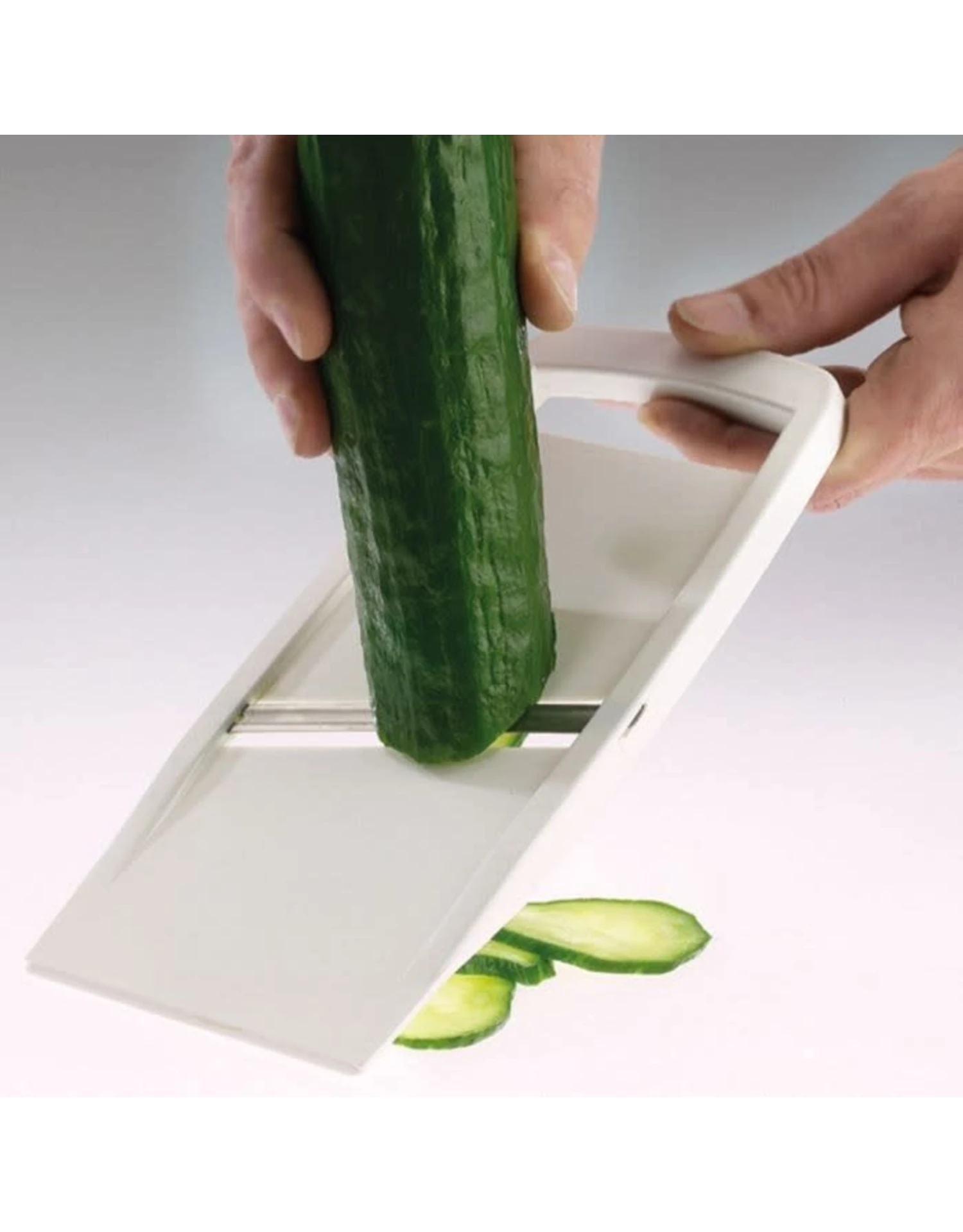 Met de groentesnijder snijd je snel en eenvoudig aardappelen, appels, uien en komkommers in dunne, gelijkmatige plakjes. Het zeer scherpe dubbelzijdige snijmes van roestvrij staal zorgt voor perfecte snijresultaten met weinig inspanning. Dankzij het verhoogde frame is het schaafoppervlak beperkt en kunnen de stukken groente en fruit niet zijwaarts glijden.