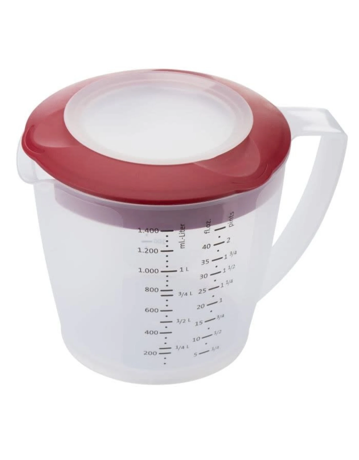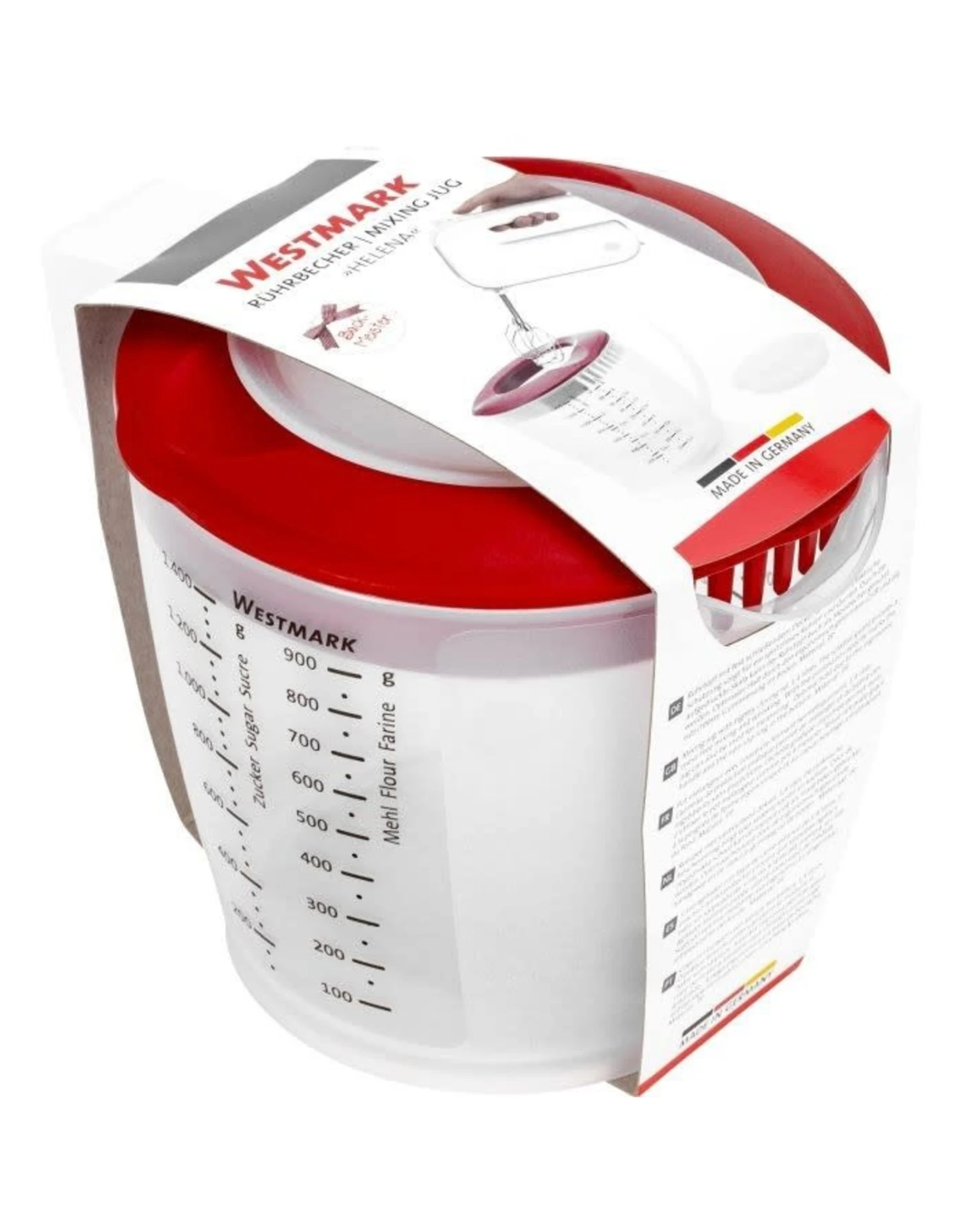 De garde is bedoeld voor het mengen en roeren van kook- en bakingrediënten en voor het bereiden van eiwitten en room. Hij heeft een inhoud van 1 liter en is geschikt voor handmixers met twee gardeopzetstukken. Het tweedelige deksel biedt een spatbeschermingsring voor schoon kloppen en een precies passend dekselinzetstuk voor het hygiënisch, smaak- en geurloos bewaren van gevoelige ingrediënten. Eenvoudig schenken is mogelijk dankzij de praktische schenktuit. Een rubberen ring aan de onderkant van de pot zorgt ervoor dat deze op gladde oppervlakken wordt vastgehouden. Door de comfortabele brede handgreep kun je de mengkom op zijn plaats houden.