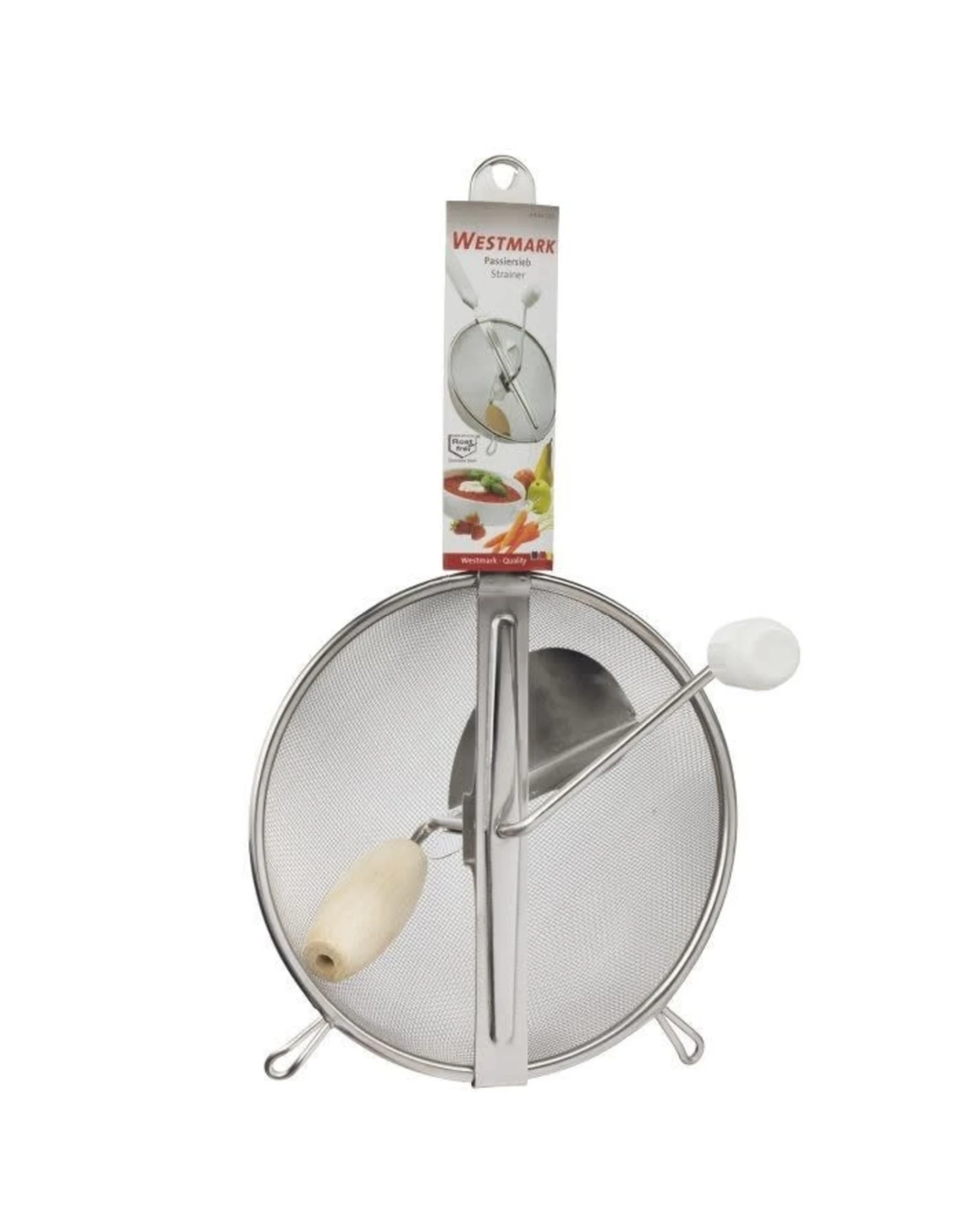 Deze klassieke zeef met fijnmazige zeef is ideaal voor het pureren en persen van groenten en fruit. De slinger met grote draaiknop maakt het gemakkelijk om te werken, bijvoorbeeld om appel- of bessenpuree te maken. De steunsteunen garanderen een veilige grip op potten en schalen. De zeef kan volledig worden gedemonteerd voor handmatige reiniging.