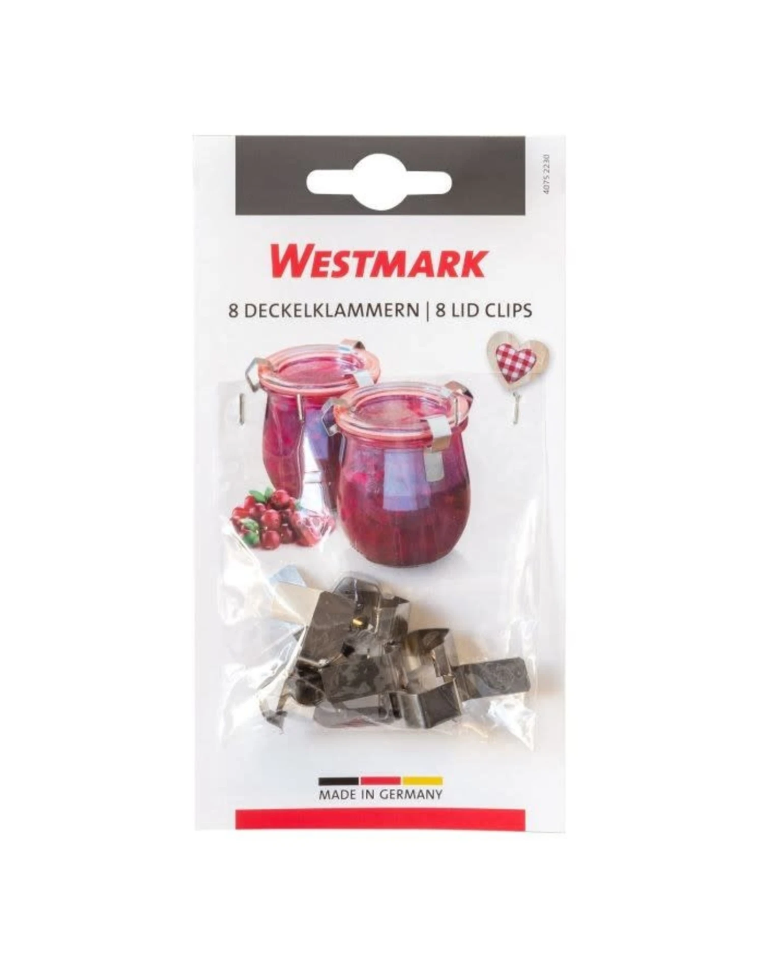Met de dekselclips van verend staal kunt u het glazen deksel samen met het conserveringsrubber betrouwbaar op de bodem bevestigen. Zo weet je zeker dat het deksel goed op zijn plaats zit tijdens het kookproces en dat het eten luchtdicht bewaard kan worden. Gebruik 2 clips per glas. De clips kunnen worden verwijderd nadat de potten zijn ingekookt en afgekoeld. Controleer nogmaals door aan te raken of het deksel luchtdicht is.
